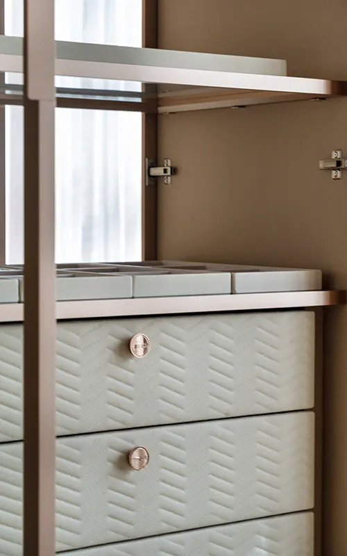 Os materiais escolhidos para compor os closets abertos em 2025 refletem uma busca cada vez maior por sofisticação aliada à durabilidade e à responsabilidade ambiental. A madeira continua como protagonista, não apenas pelo apelo visual aconchegante, mas também por sua versatilidade e longevidade. As tonalidades claras, em especial, ampliam a sensação de espaço e trazem leveza ao ambiente, reforçando a estética acolhedora que o design contemporâneo valoriza.