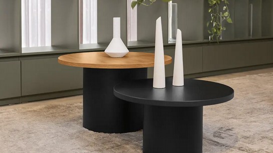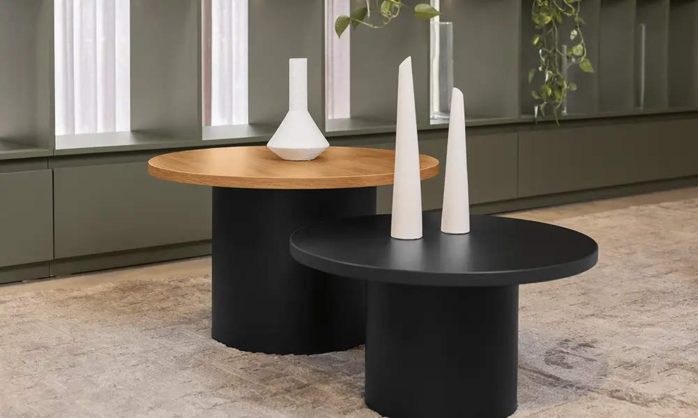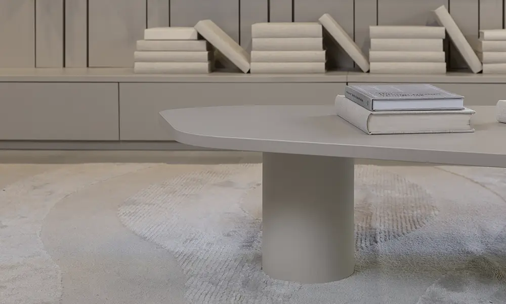 Outro componente importante da linha são os tampos orgânicos. Diferentemente das superfícies retangulares convencionais, esses tampos exploram formatos mais fluidos — como oval, circular ou composições suavemente irregulares — que introduzem movimento na composição do ambiente. Esse tipo de desenho permite criar peças que assumem protagonismo dentro do projeto, funcionando como pontos de destaque e contribuindo para uma linguagem visual mais dinâmica.