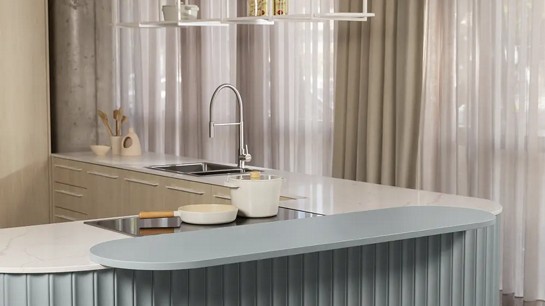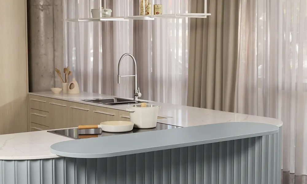 Essa característica se torna particularmente útil em projetos com áreas integradas, nos quais diferentes funções convivem dentro do mesmo espaço, já que bancadas ou ilhas curvas podem orientar o fluxo de circulação de maneira mais natural e evitar interrupções abruptas no percurso entre diferentes áreas do ambiente.
